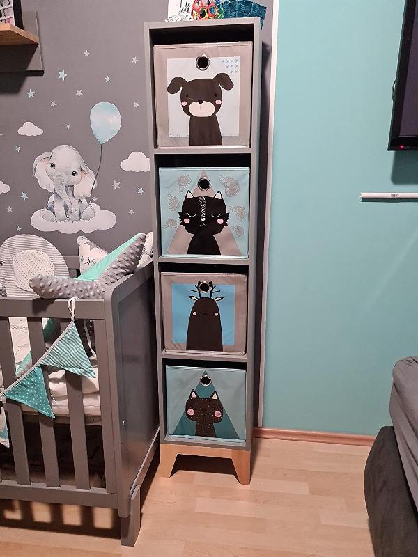 - Die Regalbox für Kinder ist abwaschbar und mit einer Öse ausgestattet, durch die ein Finger leicht herausgezogen werden kann. Auf den Boxen sind bunte Kinderfiguren gemalt.