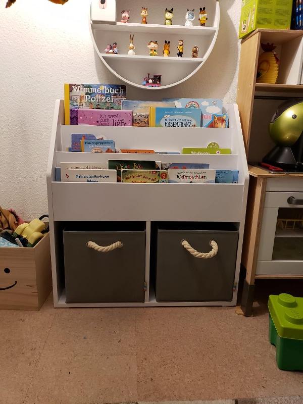 » Dieses Kinderregal bietet viel Stauraum für Spielzeug und Bücher. Das design ist hübsch gestaltet mit den Bedruckten Boxen. Allgemein macht das regal einen hochwertigen Eindruck. Allerdings ist der Aufbau recht kompliziert. Es ist zu Anfang nicht einfach zu erkennen welches Teil in der Anleitung gemeint ist. Besonders störend fand ich, dass die Rückwand mit Schrauben anstatt Nägeln befestigt wird. Die Schrauben rutschen schnell weg und man muss sehr viel Kraft aufwenden. Dadurch habe ich versehentlich zwei unschöne Löcher in die Rückwand gebrochen.