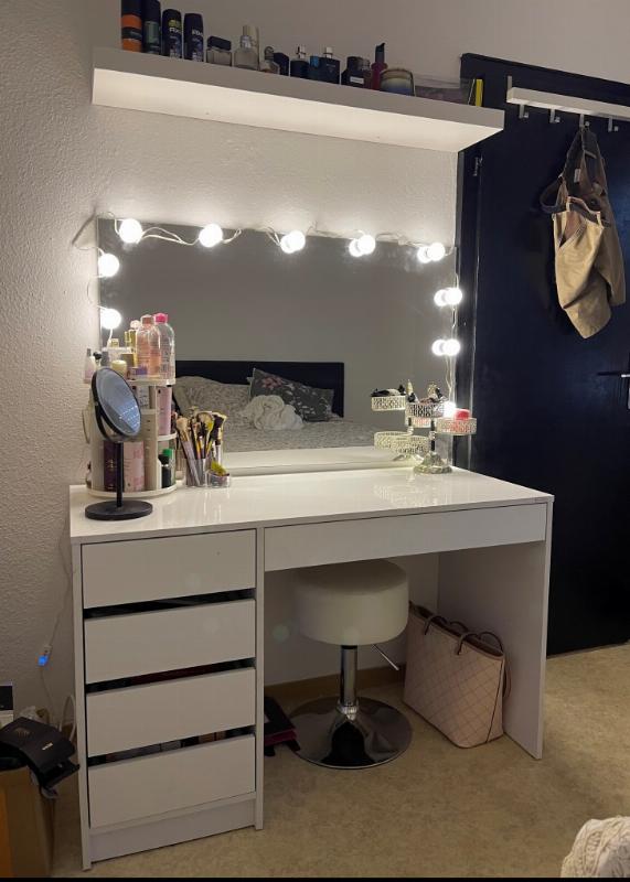 » La coiffeuse est magnifique, elle a transformé ma chambre. L’éclairage est doux mais efficace, et tout mon maquillage tient dans les tiroirs.