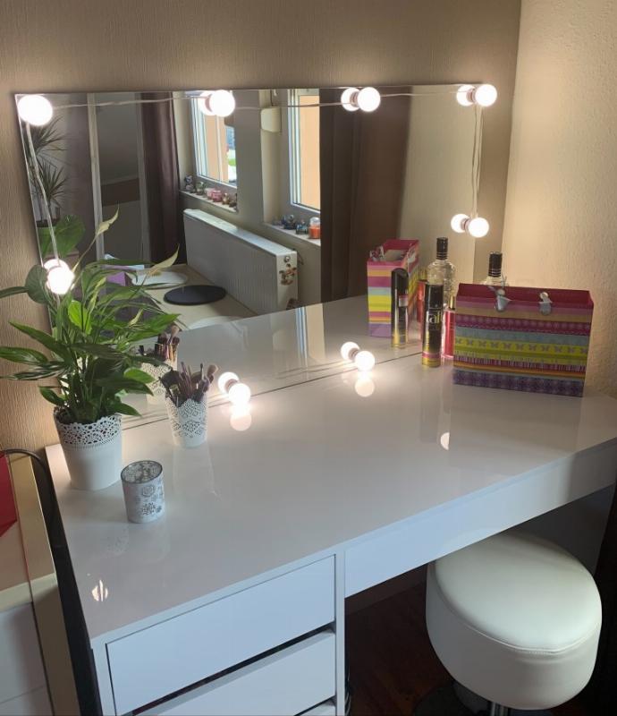 » Der Schminktisch ist genau so wie ich es erwartet habe. Bin sehr zufrieden das es viele Schubladen gibt, gibt es nicht überall. Spiegel mit den Lampen passt auch perfekt dazu. Was mich noch überrascht hat, ist das die Lampen sehr hell sind und man damit viel besseres Licht hat.