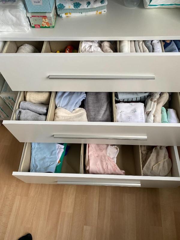 » Wickelkommode ist praktisch und sieht modern aus. Sie bietet ausreichend Stauraum, aber ich empfehle, die Beine näher an die Vorderseite zu setzen, da die Kommode beim Öffnen der Schubladen nach vorne kippen kann. Außerdem wäre es gut, die obere Fläche für das Wickeln zusätzlich zu sichern, da sie sich bei Druck nach vorne neigen kann. Insgesamt bin ich zufrieden mit dem Kauf!