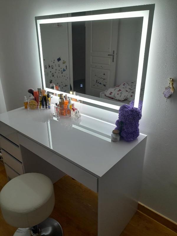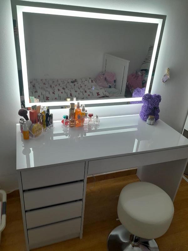 - DIMENSIONS : La Coiffeuse avec miroir led et tabouret mesure 120 cm - Largeur, 75 cm - Hauteur, 55 cm - Profondeur. Toutes les tailles détaillées sont indiquées sur les photos.