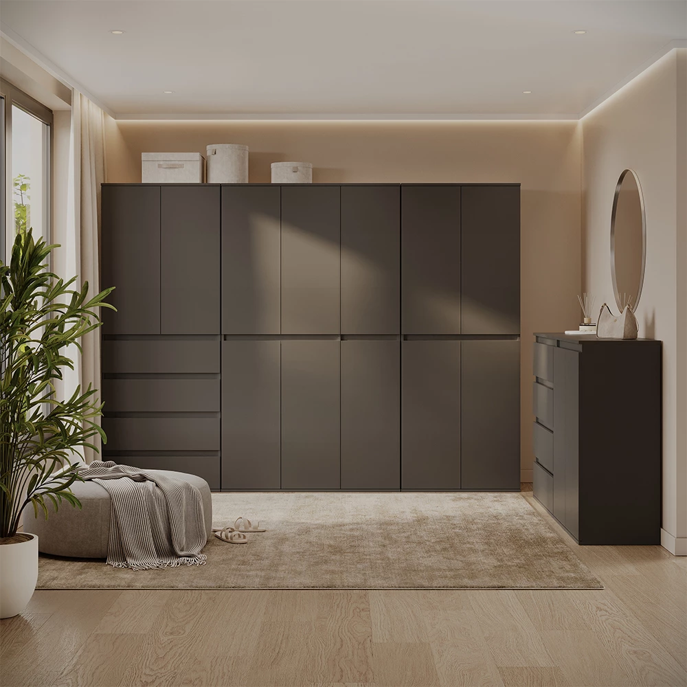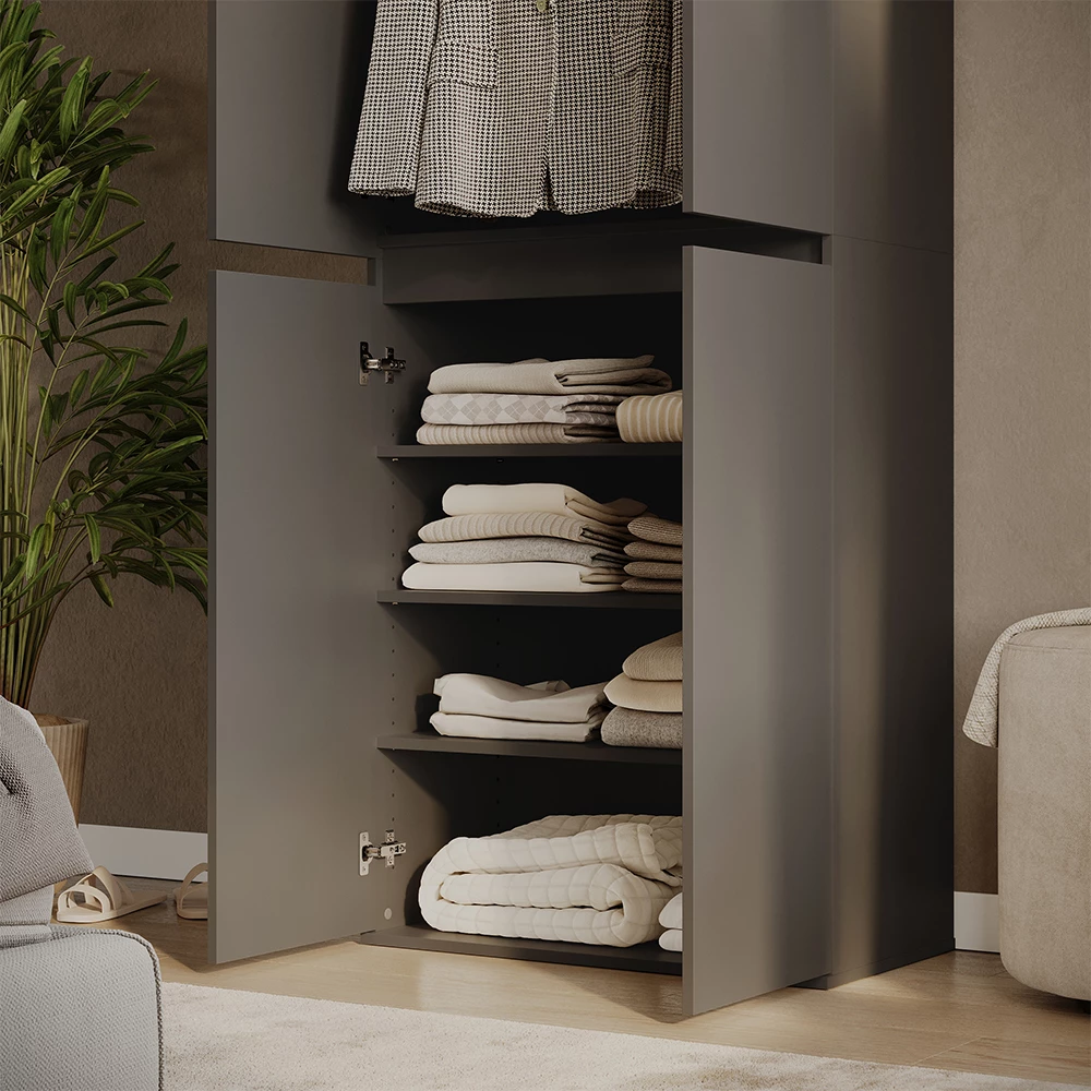 OVERZICHT VAN LEVERING: Planken set van 2 inclusief montagehandleiding en montagemateriaal (decoratie niet inbegrepen).)De Claus garderobekast maakt indruk met zijn moderne ontwerp en praktische indeling met twee deuren en vier lades die royale opbergruimte bieden. De kast is ideaal voor elke kamer en past harmonieus in verschillende inrichtingsstijlen.